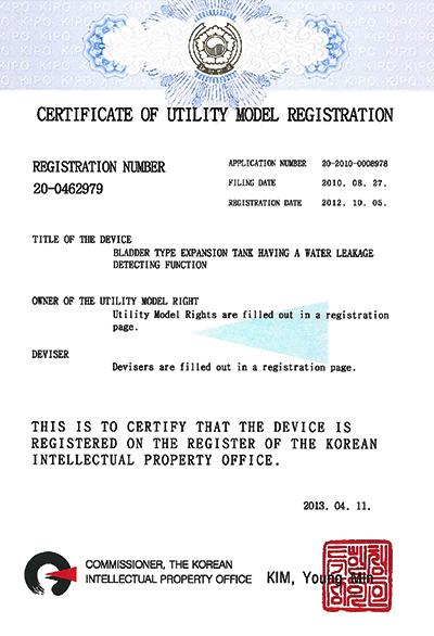 BLADDER TYPE EXPANSION TANK HAVING A WATER LEAKAGE DETECTING FUNCTION | COMMISSIONER, THE KOREAN INTELLECTUAL PROPERTY OFFICE |