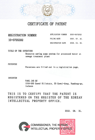 ENERGY SAVING TYPE BOOSTER PUMP SYSTEM FOR WATER WORKS | COMMISSIONER, THE KOREAN INTELLECTUAL PROPERTY OFFICE |