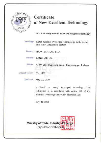 Certificate of New Excellent Technology | Ministry of Trade, Industry & Energy Republic of Korea | |
